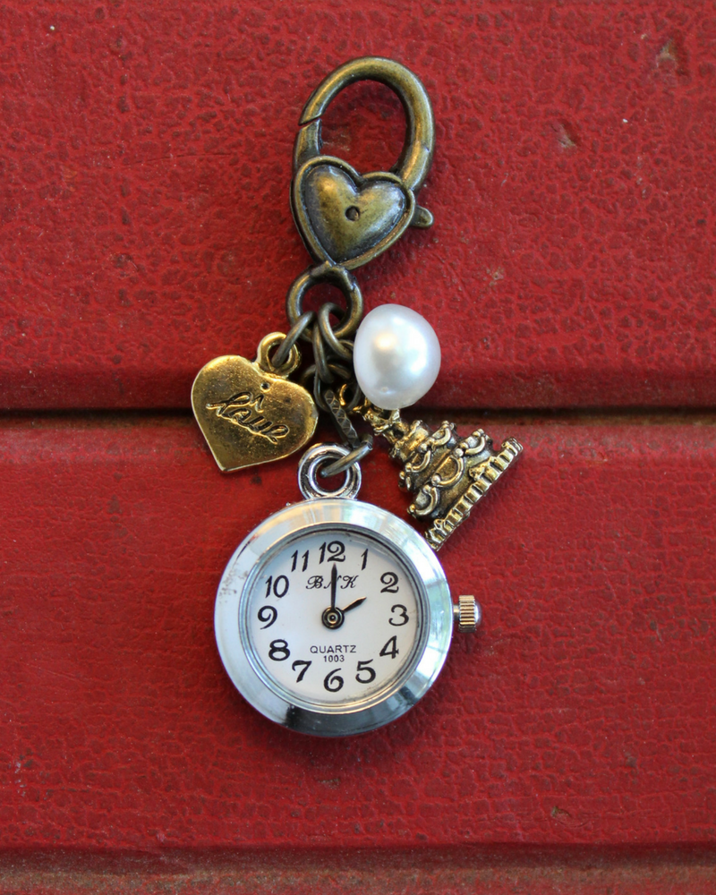 The battery has been removed so it can be permanently set to the time of the wedding. There is also a vintage wedding dress button attached.