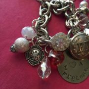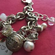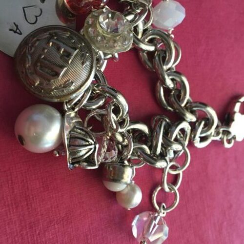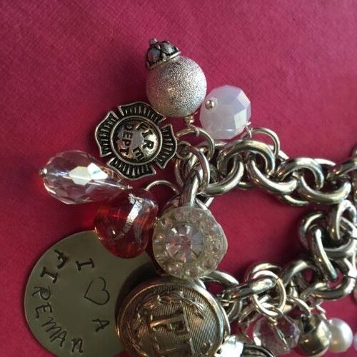 There are 14 items on it including a helmet & shield charms, Fireman coat button & a vintage buttons and some beads. This bracelet is set up to be worn on the left wrist.