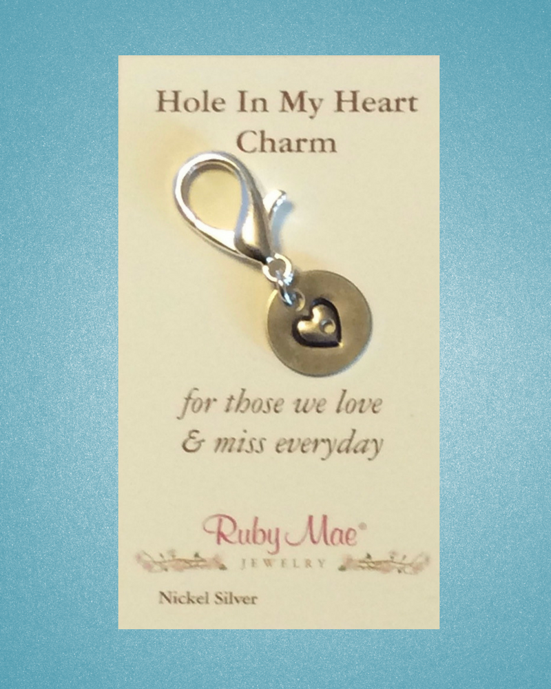 This charm was created by my dad Jake who misses my mom Patty Mae. He stamps, stains & polishes each one by hand. He thought there might be more people like him who have a hole in their heart.
