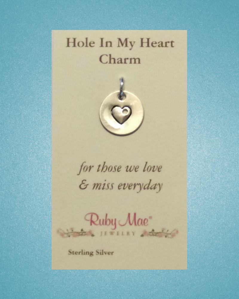 He creates all of our hand stamp charms and one night he came by with a round charm with a heart stamped onto it with a hole thru it. He said to me, “this one is for people like me with a hole in their heart missing a loved one everyday”.